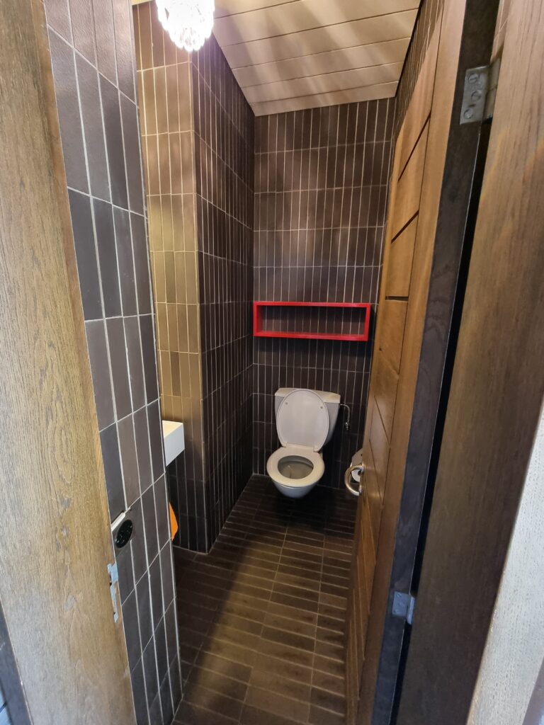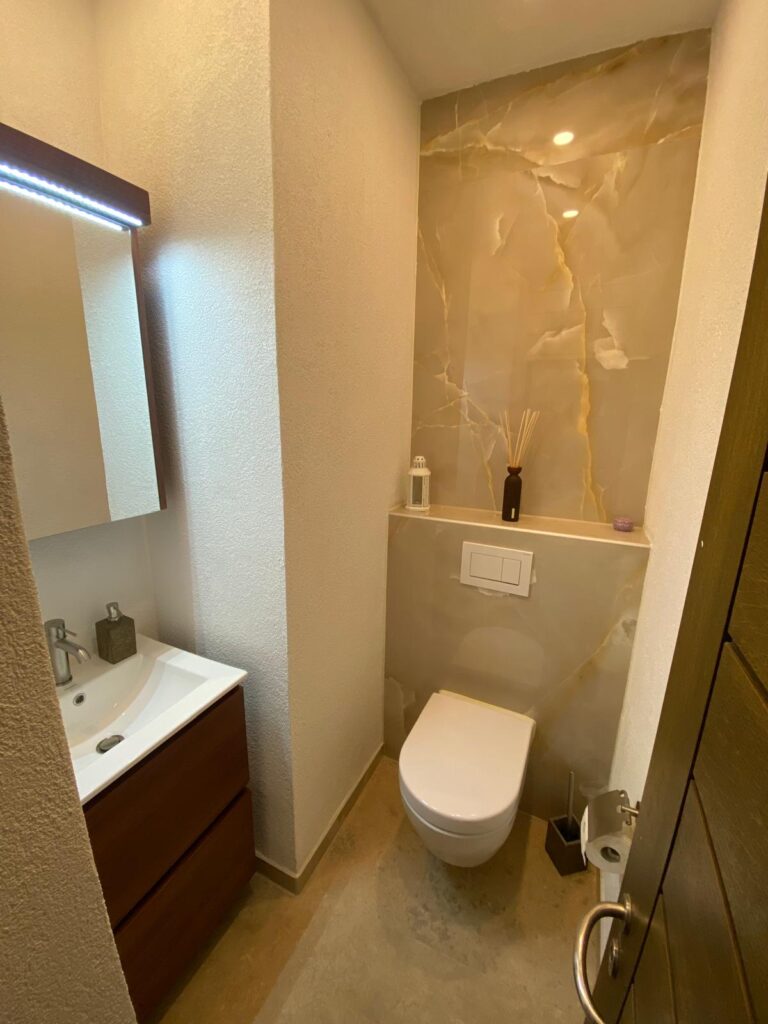 WC vollständig erneuert mit neuer Wandverkleidung in Natursteinoptik.
