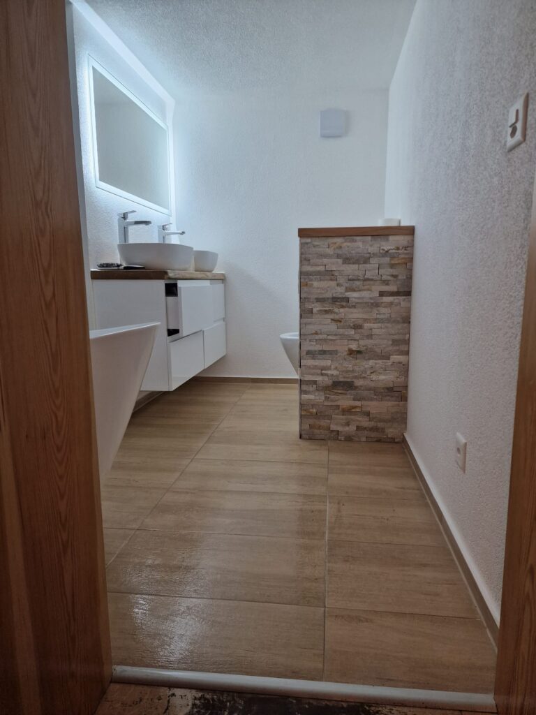 Neuer Bodenaufbau mit Estrich und Installation von Badewanne und Möbel.